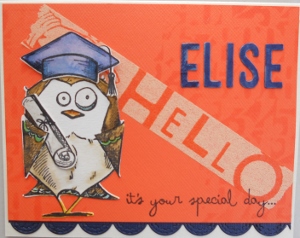 On bright orange Bazzill cardstock I applied Versamark Ink through mini stencil #058. Can't believe I actually had some orange inked washi tape in my stash - perfect! The wise old Crazy Bird owl was stamped in Jet Black Archival Ink onto watercolor cardstock and cut out with the coordinating die. Ditto for the diploma and cap from Crazy Things. The sentiment from Crazy Talk was stamped in JBAI. From blue cardstock I die cut her name using the 1" Alphanumeric dies. The Stitched Ovals border was cut from the same blue cardstock.